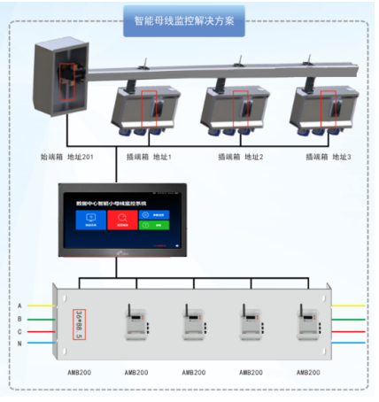 母線智能監(jiān)控系統(tǒng)由智能母線監(jiān)控裝置、電流互感器、母線接頭測溫裝置、無線通訊終端和觸摸屏組成。