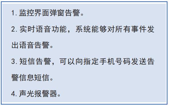 告警功能:在監(jiān)控中心對環(huán)境參量超過預設值時發(fā)出視聽告警,在監(jiān)控系統(tǒng)的人機界面上閃爍顯示,同時可以提供警示燈、報警音箱、語音、短信通知等多種告警方式。