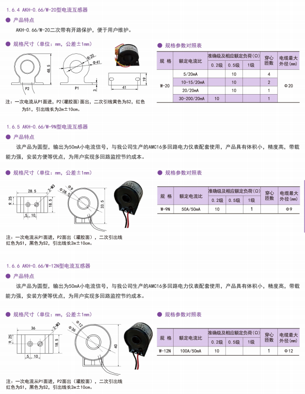 AKH-0.66 W系列電流互感器輸出為5-20mA等小電流信號,與我公司生產(chǎn)的AMC16多回路電力儀表配套使用,產(chǎn)品具有體積小,精度高,帶載能力強,安裝方便等優(yōu)點,為用戶實現(xiàn)多回路監(jiān)控節(jié)約成本,有圓型和方型供用戶根據(jù)需要選用。